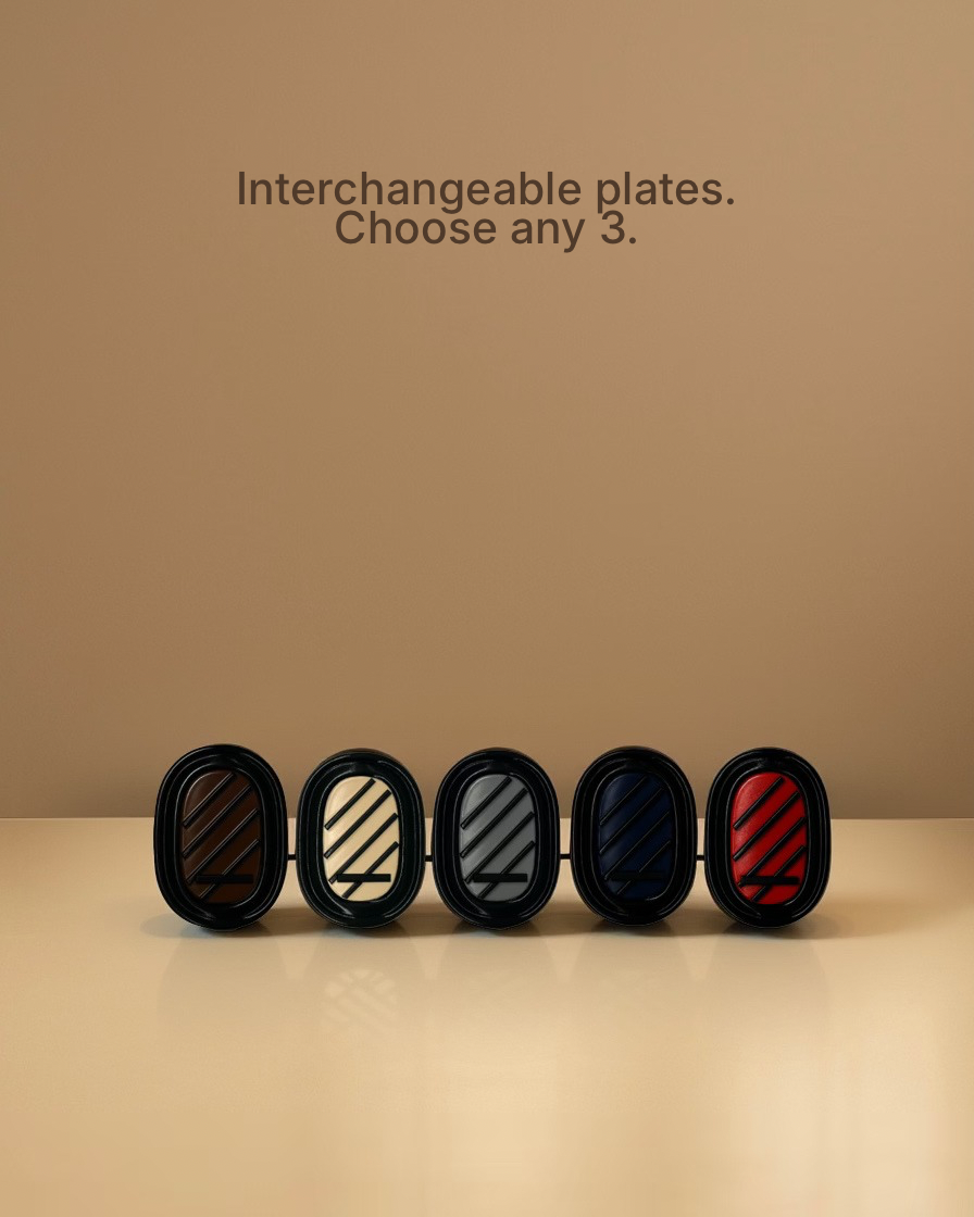 Engineered with a magnetic dual-plate design that ensures effortless alignment and timeless style. A durable back plate with vent clip and an interchangeable front plate that attaches seamlessly with a secure magnetic mechanism. Each set includes three front plates in your choice of Navy, Beige, Brown, Grey, and Red, letting you switch between classic tones with ease while maintaining the diffuser’s timeless sculpted form.